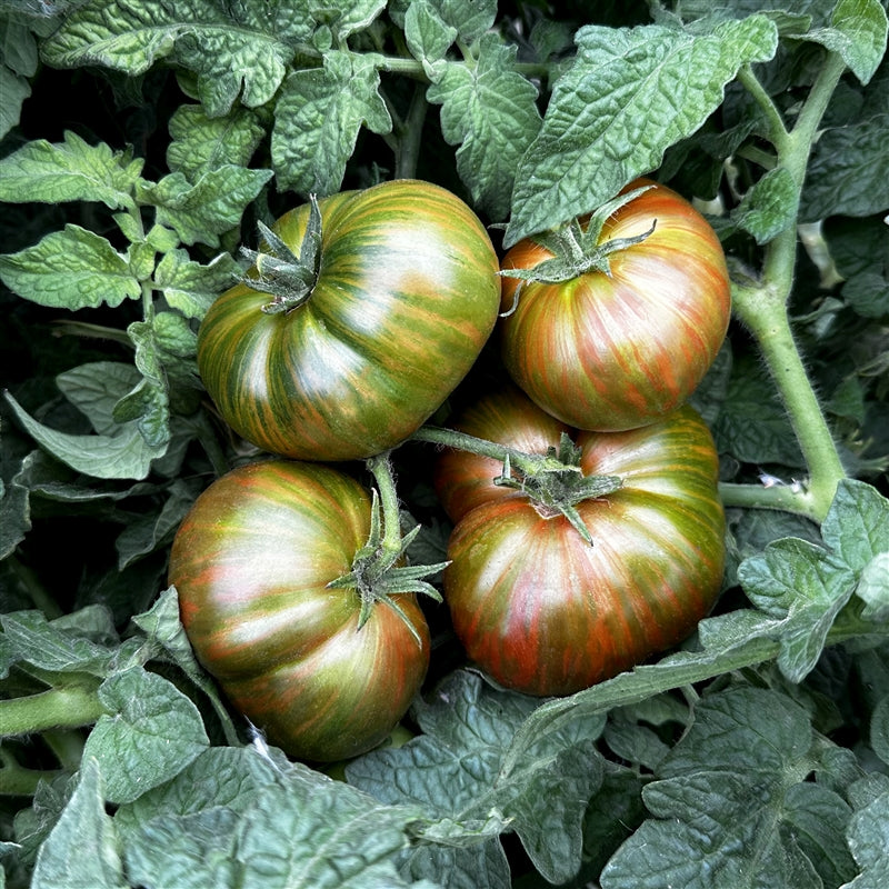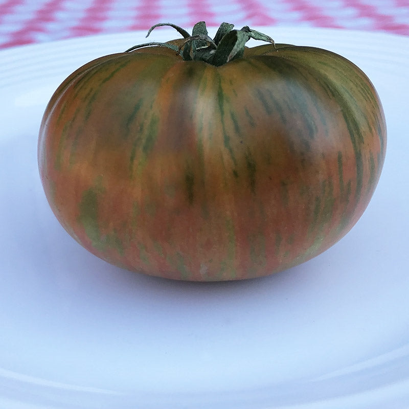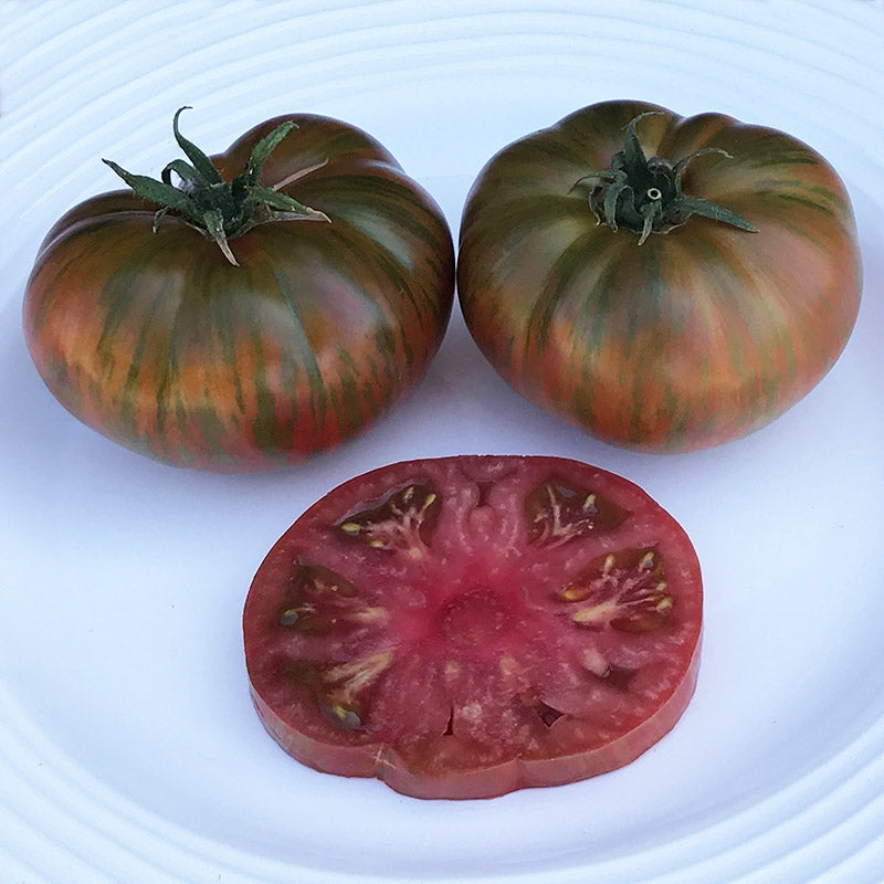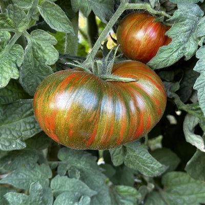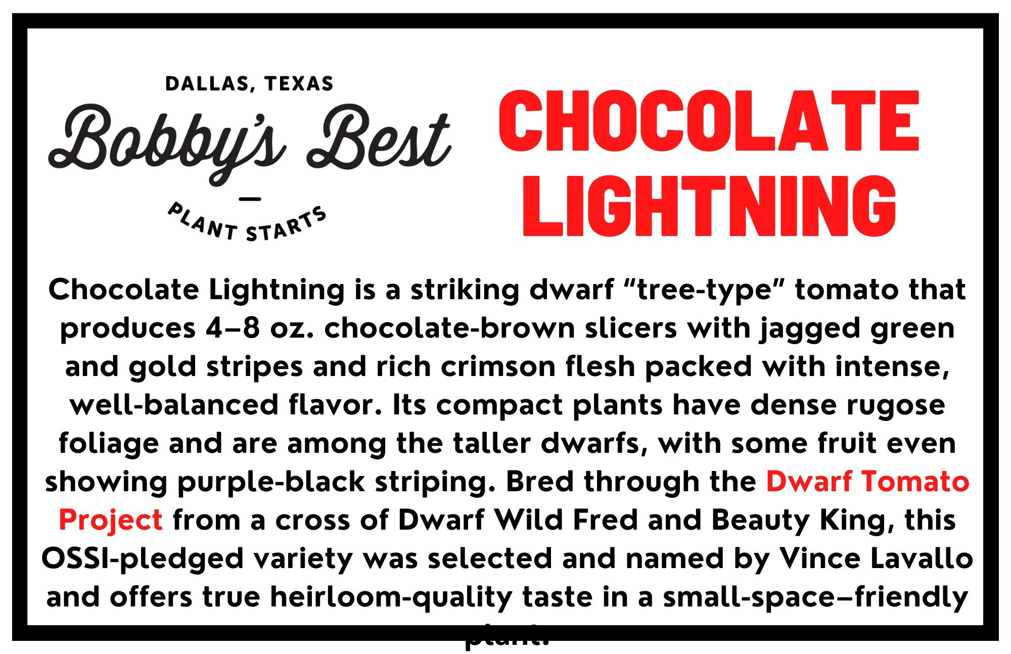 Chocolate Lightning is a striking dwarf “tree-type” tomato that produces 4–8 oz. chocolate-brown slicers with jagged green and gold stripes and rich crimson flesh packed with intense, well-balanced flavor. Its compact plants have dense rugose foliage and are among the taller dwarfs, with some fruit even showing purple-black striping. Bred through the Dwarf Tomato Project from a cross of Dwarf Wild Fred and Beauty King, this OSSI-pledged variety was selected and named by Vince Lavallo and offers true heirloom-quality taste in a small-space–friendly plant.